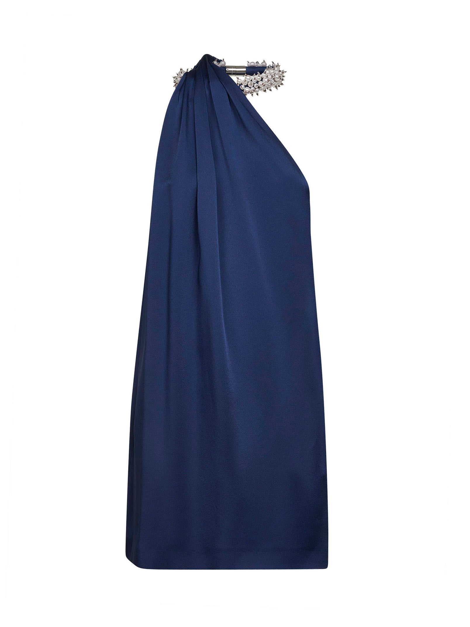 Miniabito monospalla in envers satin blu navy con perle